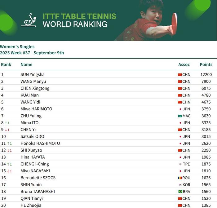 女单:孙颖莎12200分、王曼昱、陈幸同、蒯曼、王艺迪位列前五,陈熠第9