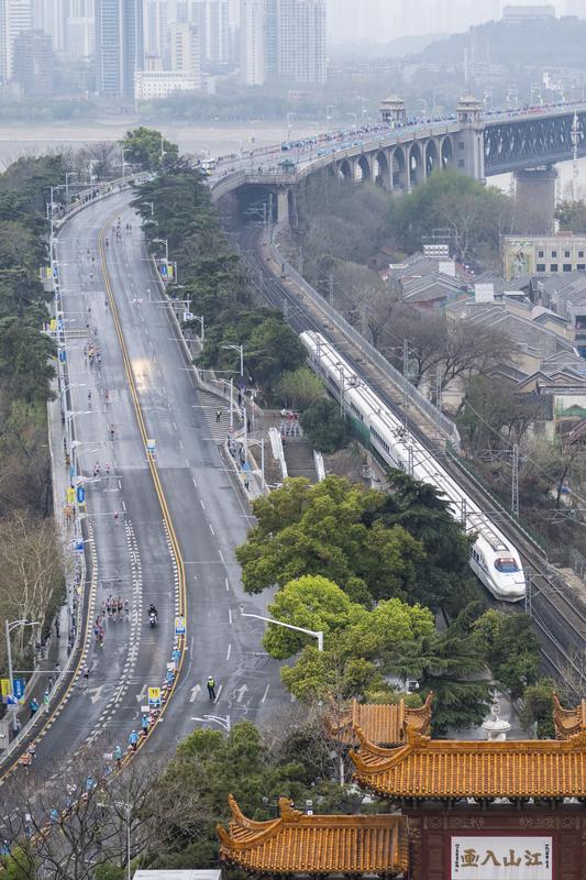3月23日,武汉马拉松参赛选手经过黄鹤楼。新华社记者 伍志尊 摄